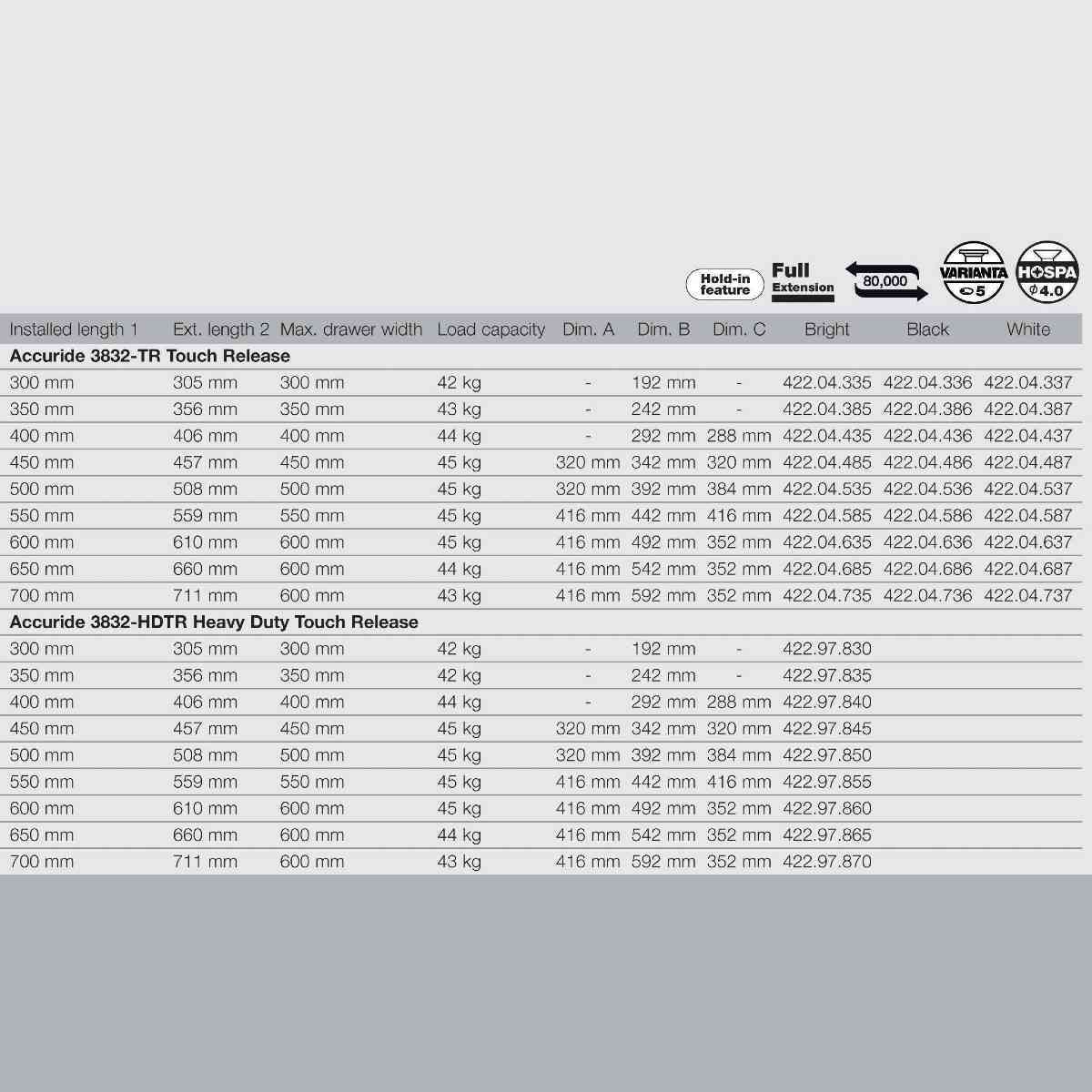 Accuride 3832TR touch release is a telescopic, side-mounted cam adjust slide with a full extension and a load capacity of 45kg. The slide is activated by a push that requires only a minimum amount of effort and eliminates the need for knobs or handles. The opening mechanism is activated by 2mm travel inward and propels drawers open approximately 51-27mm from the closed position. The slide also features a lock-in feature that helps keep drawers closed, a lever disconnect, and a cam drawer adjust feature