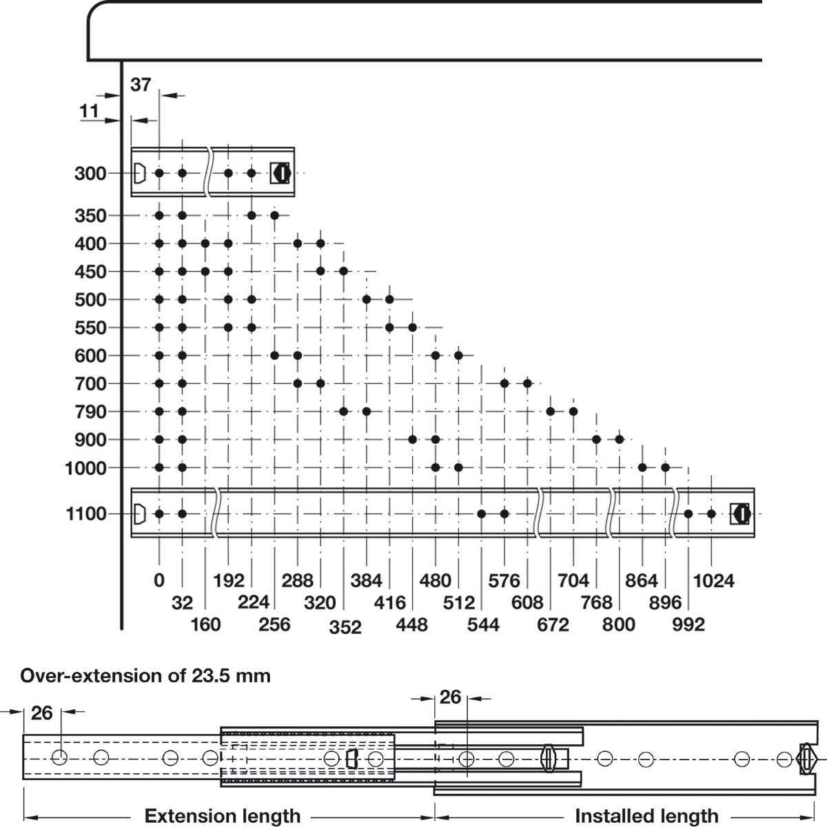 - Drilling pattern: 32mm