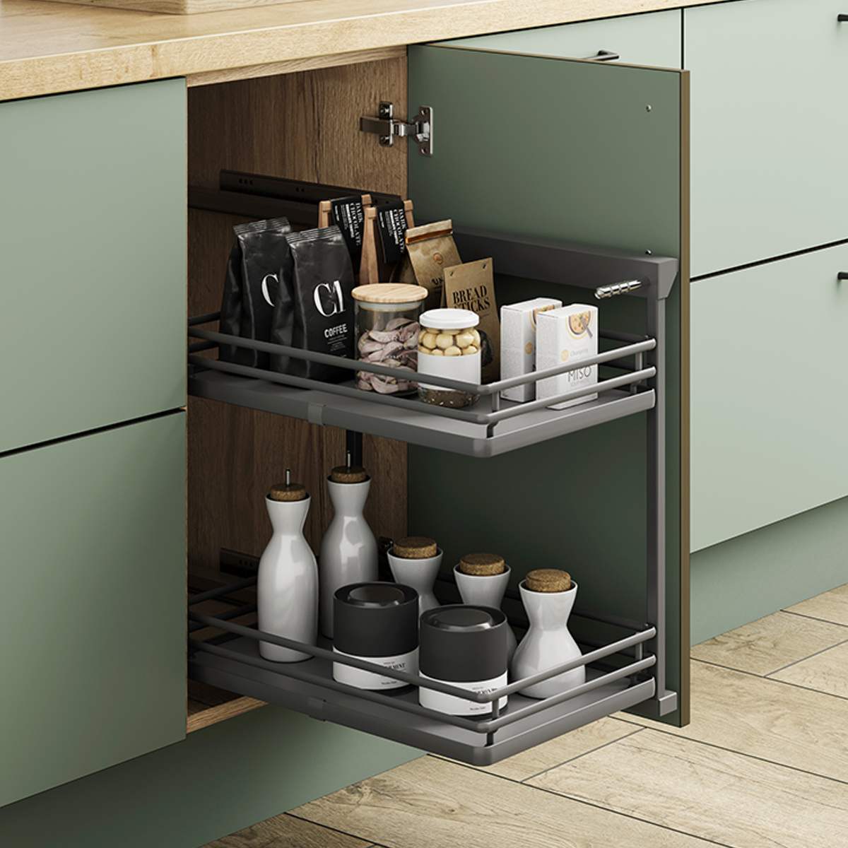 Anthracite side-mounted individual mini larder is suitable for kitchens and annexes. The sleek design allows you to use up space in your cabinets and gives you easier access to the back of the cabinet with the pull-out function.