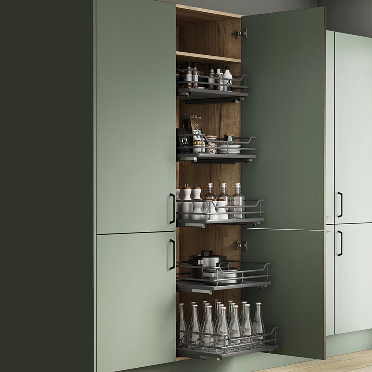 The premium product added to Buller’s already comprehensive offer of wire work storage solutions are these solid base pull-out basket drawers complete with soft close. The drawers are designed for use in kitchen cabinets constructed from 18mm board. Available in anthracite wipe clean solid base & a full range of sizes from 300–1000mm