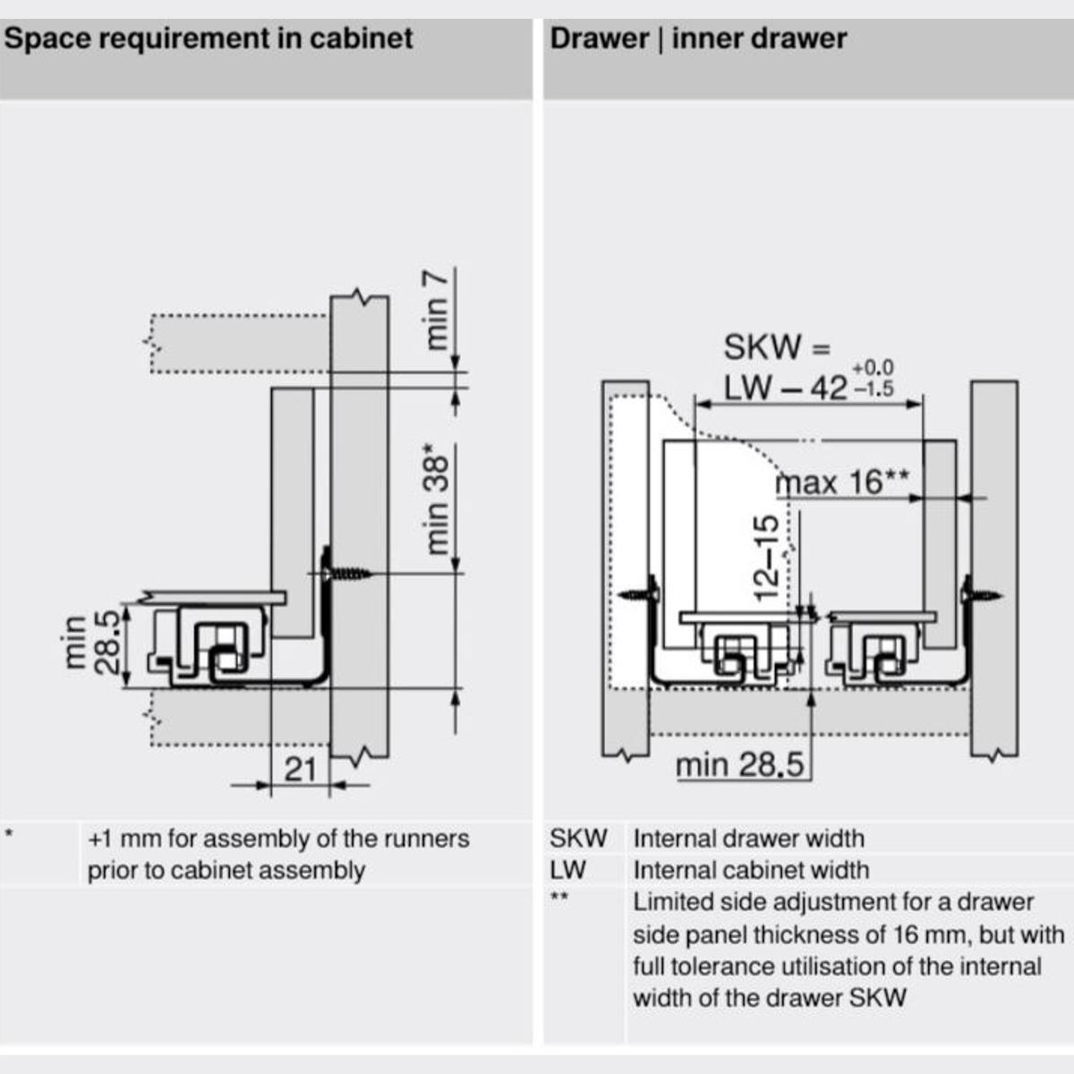 - ** Limited side adjustment for a drawer side panel thickness of 16mm, but with full tolerance utilisation of the internal width of the drawer