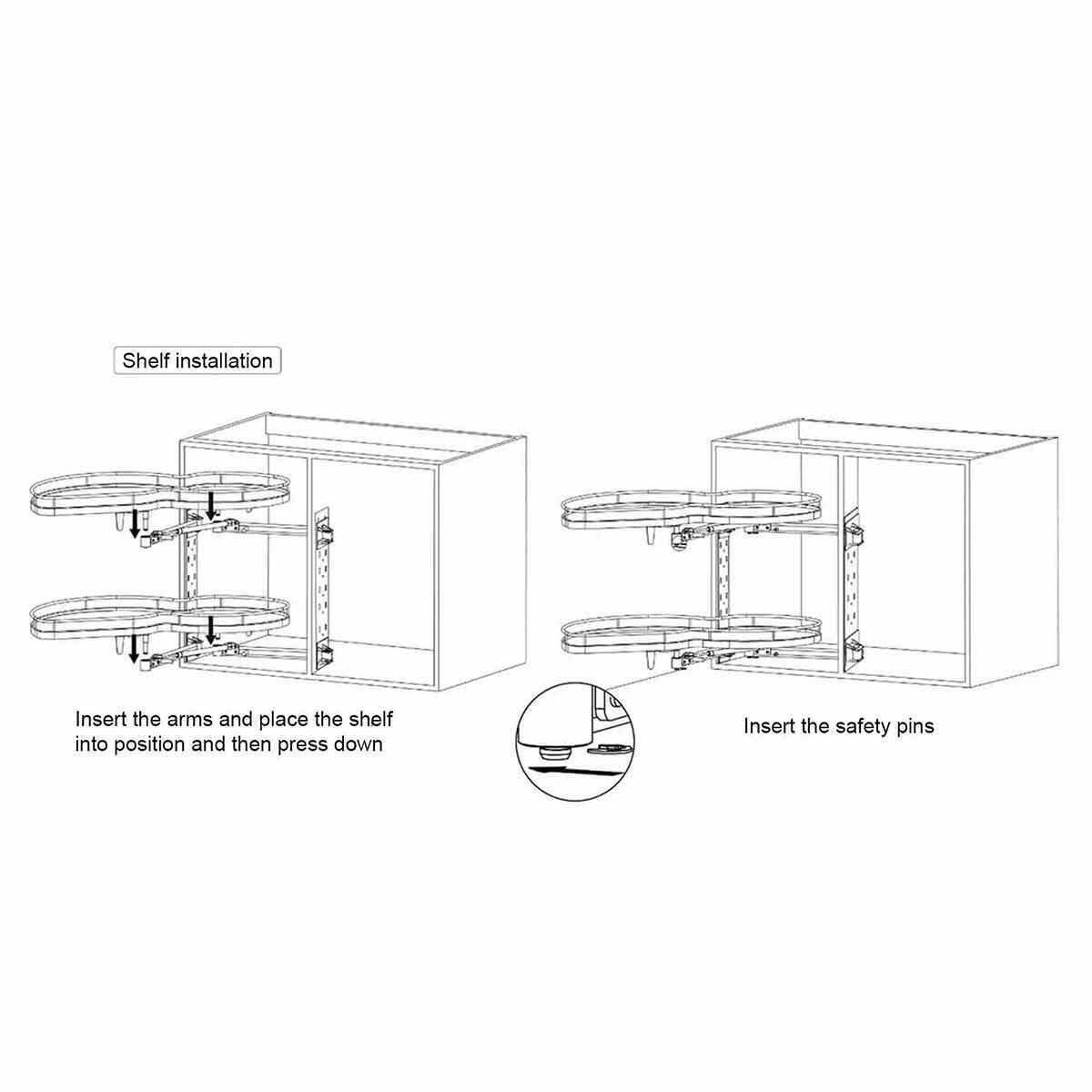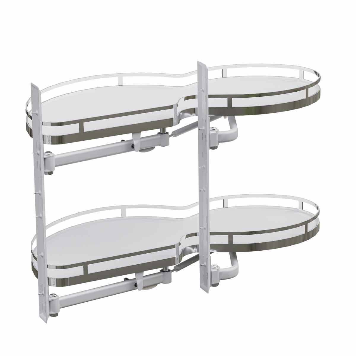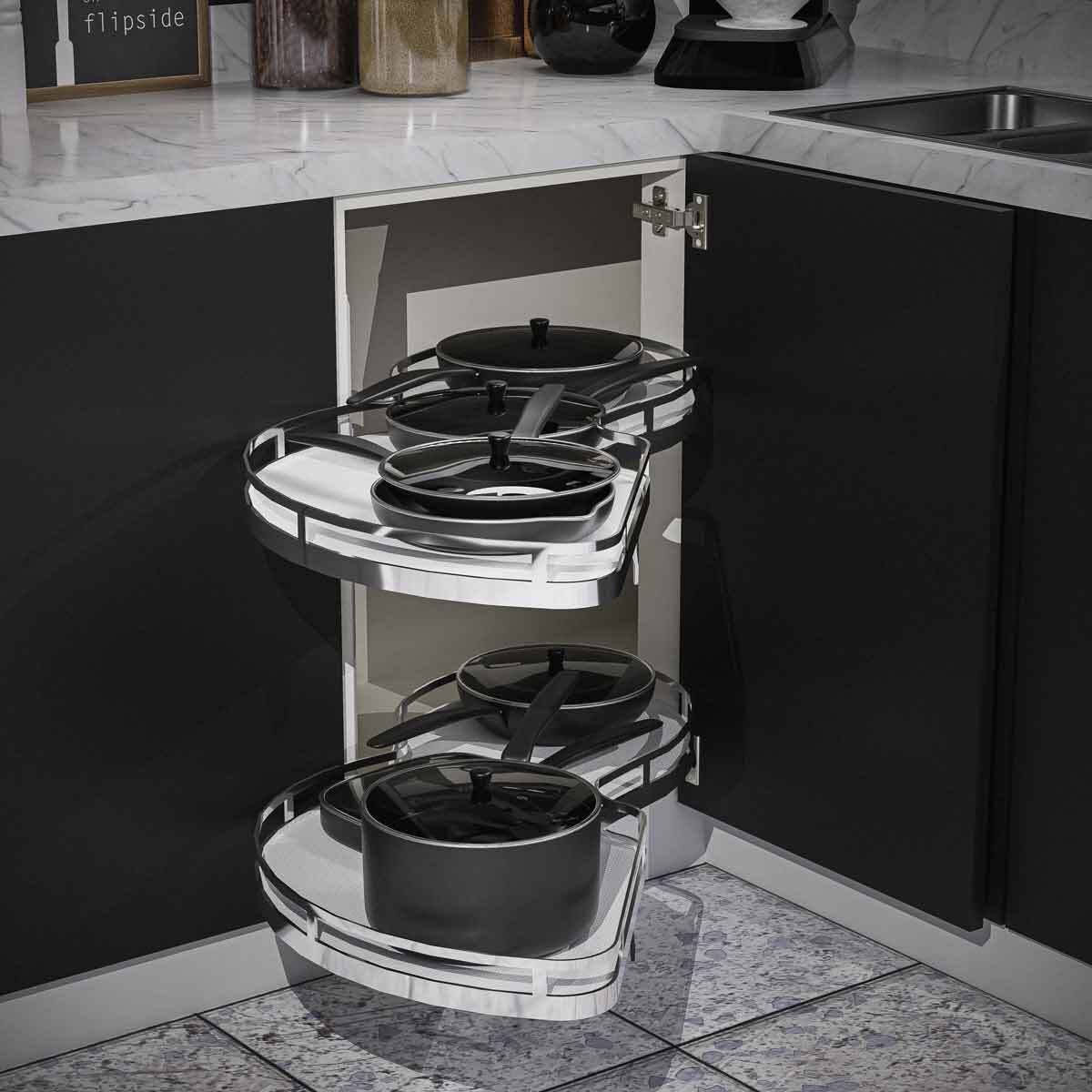 The Delta Corner pull-out in white/chrome is a system designed for blind corner cabinets. It features two independent sliding baskets, maximizing the use of space in the cabinet’s depth. Equipped with a round railing, an anti-slip mat, and a soft-close system, this corner cabinet system ensures convenience and organization. This pull out unit is great for storing pots, pans, spices, grocery, jars and other kitchen essentials.