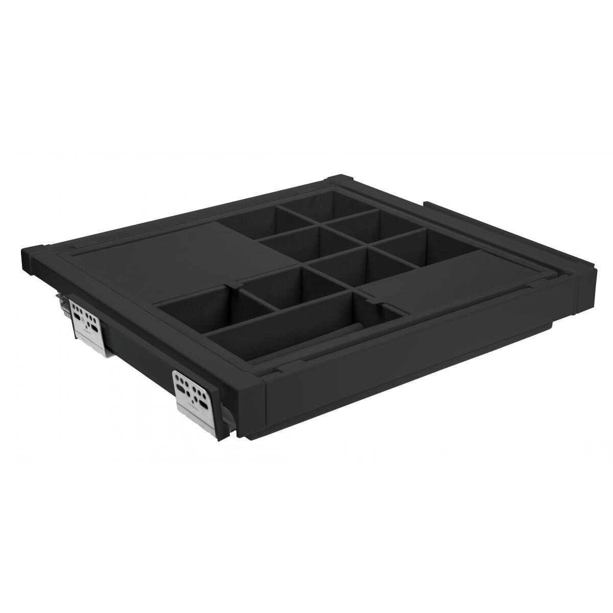 Upgrade your wardrobe with the Elite pull-out jewellery tray soft-close system - a sleek, durable storage solution designed to keep your jewellery neatly organised and within easy reach. The full-extension runners allow the drawer to glide out smoothly for complete visibility of your jewellery, while the integrated soft-close mechanism ensures quiet and effortless operation. Its adjustable frame offers a precise fit across multiple cabinet sizes, and the modern concealed design provides a clean, premium finish ideal for contemporary wardrobes.