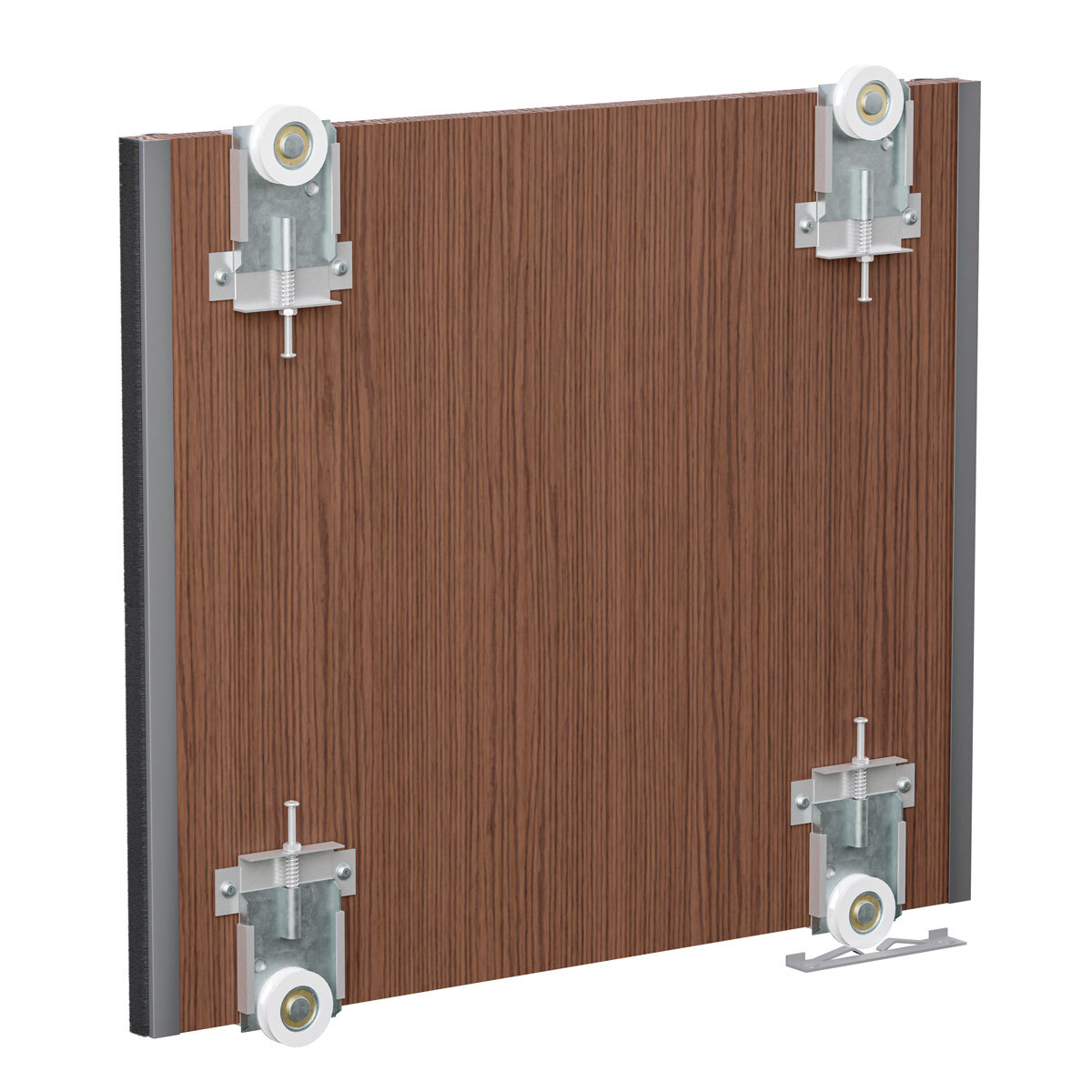 Complete set of fitting for one door for a Fastor spring loaded sliding wardrobe system. This kit will help you create a nice modern sliding wardrobe door in no time - you only need to cut your 18mm MDF, MFC or plywood, attach the wheels and knock on the aluminium profile handle trims on the sides.