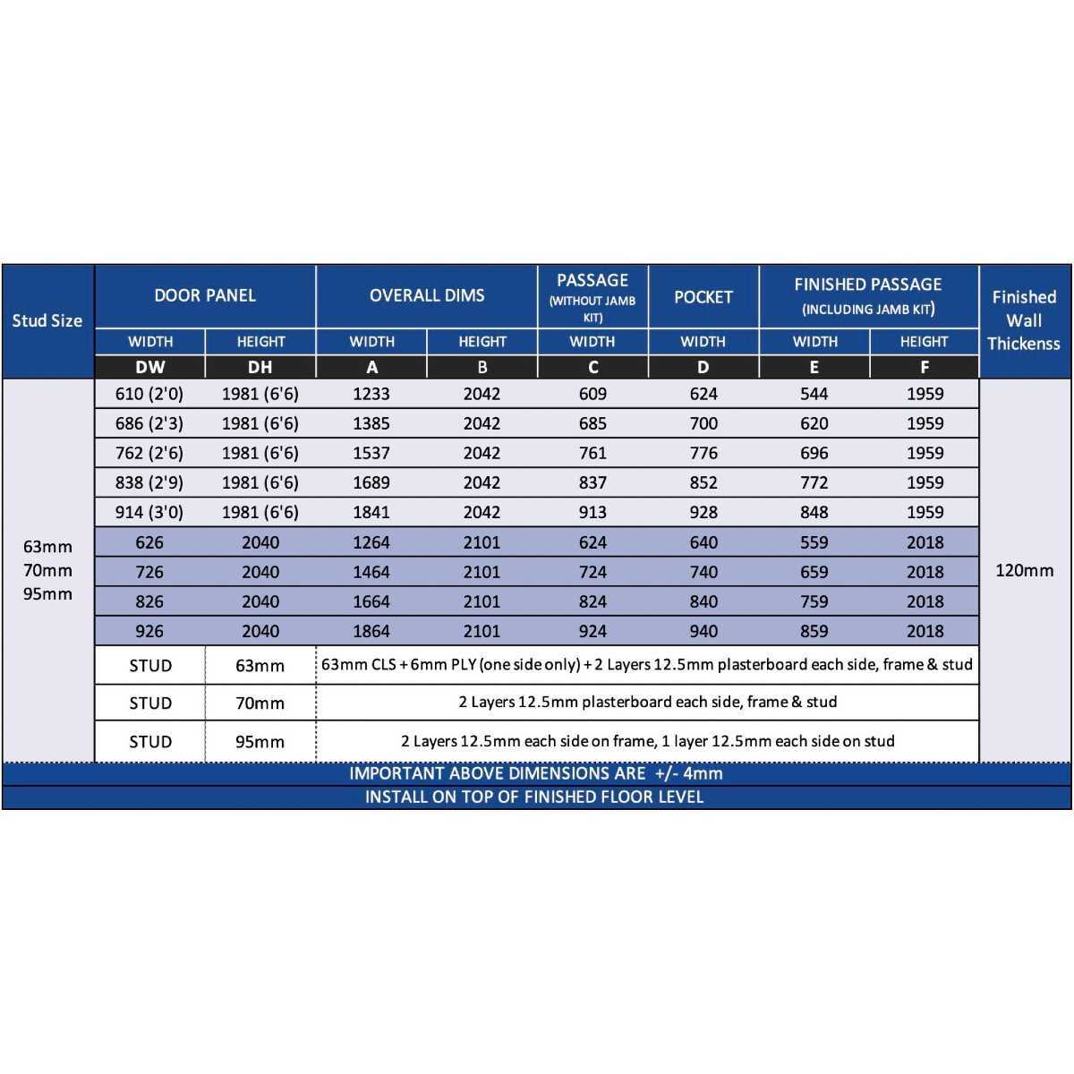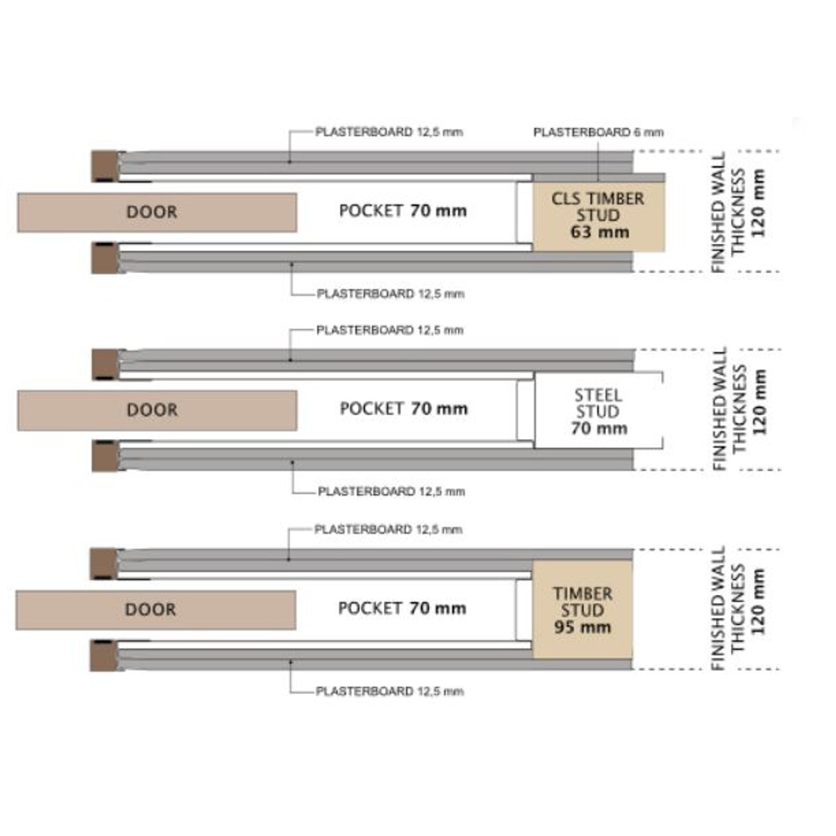 Complete fire rated pocket sliding door system with galvanised steel pocket frame, sliding track and running gear. 70mm thick frame is made specifically to fit 63/70/95mm stud work making installation even easier than before. Perfect solution to complete a finished wall thickness of 120mm.