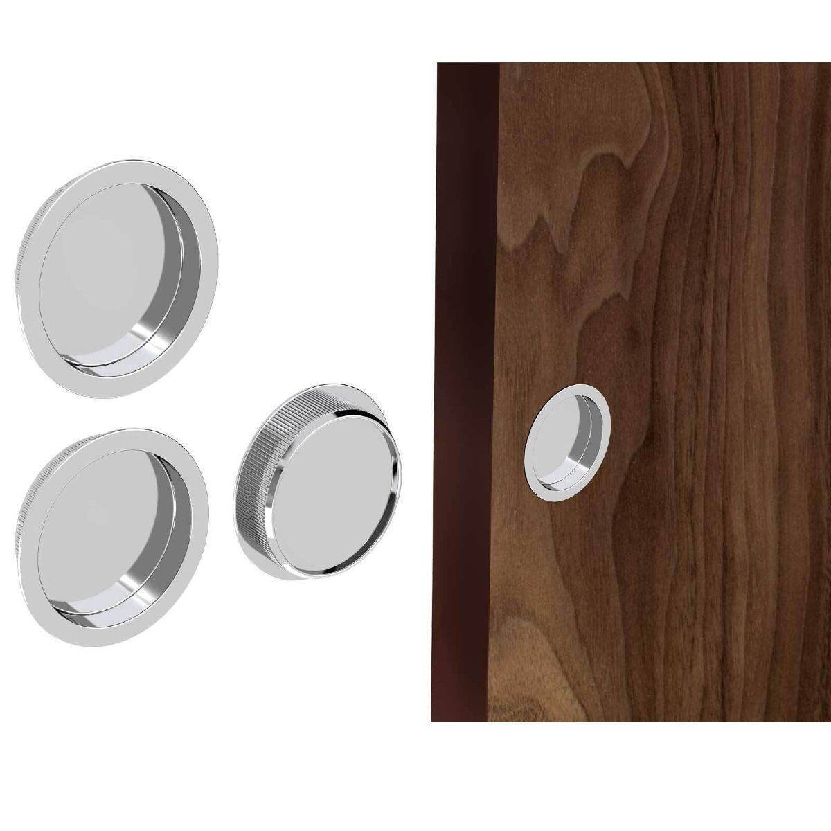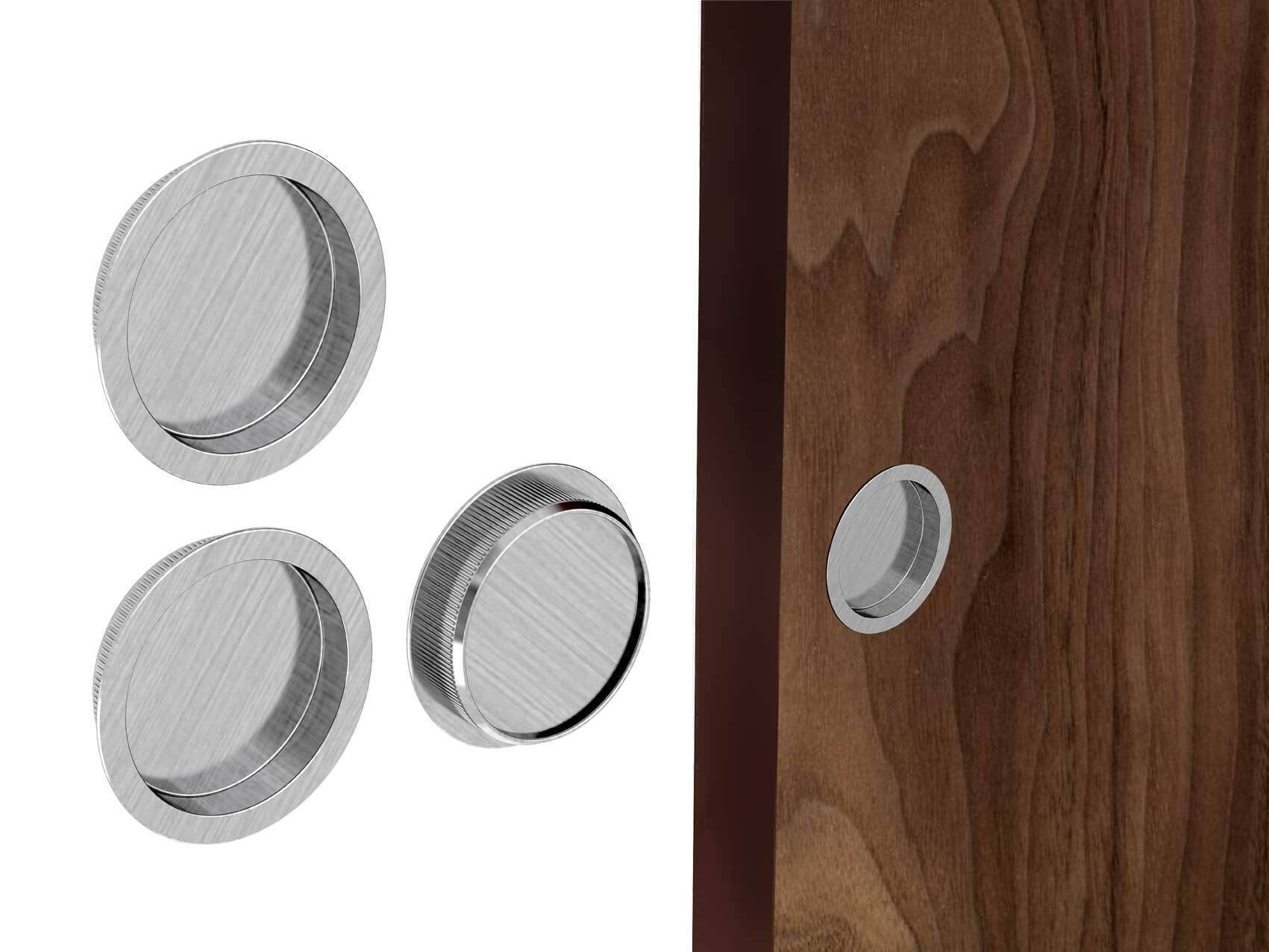 Set of round flush handles available in three popular finishes. Great quality and is perfect for sliding doors.
