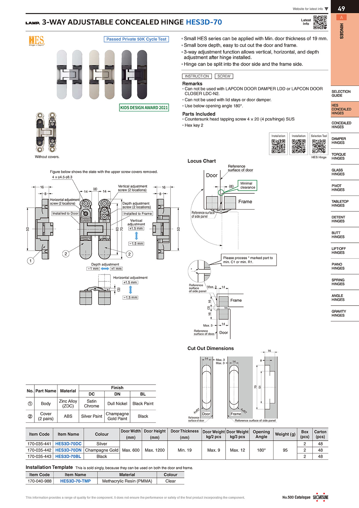 The Sugatsune HES3D-70 concealed hinge is renowned for its exceptional durability and sleek, modern design, making it an ideal choice for high-end cabinetry and furniture applications. This innovative hinge not only ensures a seamless and elegant appearance but also provides smooth and reliable operation, enhancing the overall functionality and aesthetic appeal of your projects. Whether you’re working on residential or commercial installations, the HES3D-70 offers the perfect blend of form and function to meet the most demanding design standards. Dedicated for room dividing or entrance doors making installation a breeze with 3 way vertical, horizontal and depth adjustment.