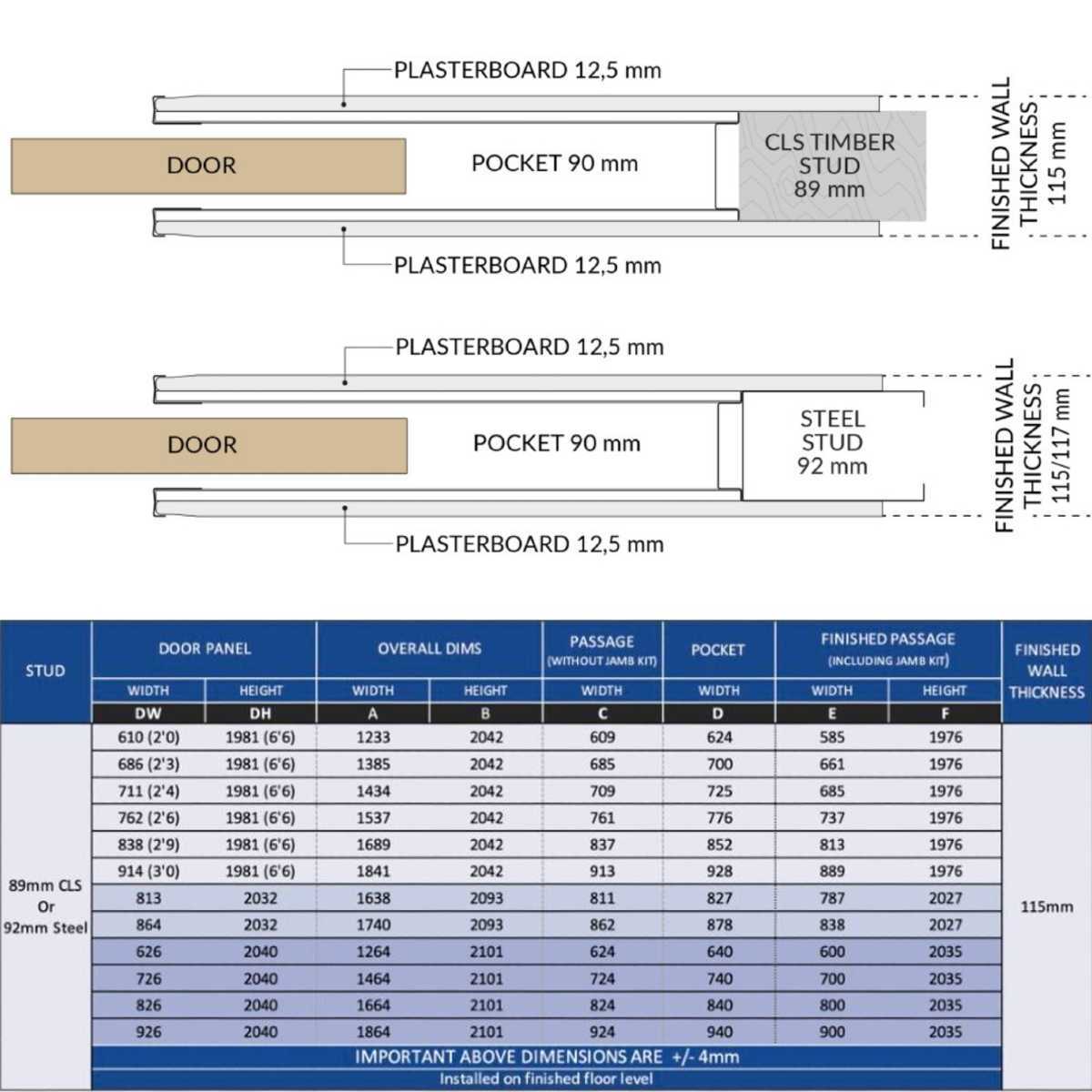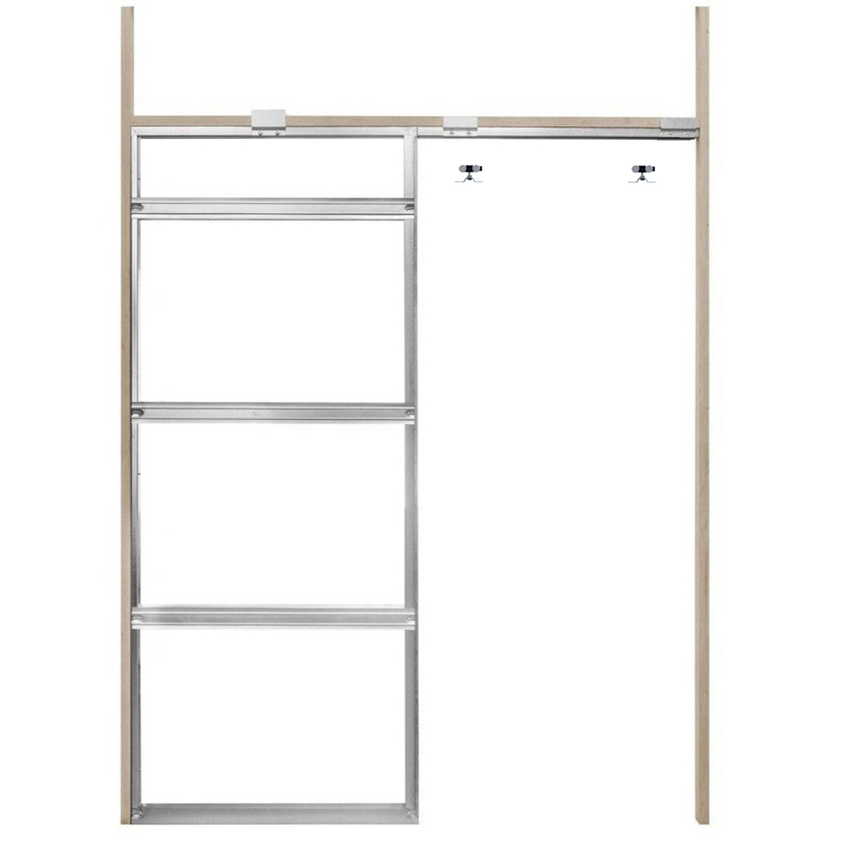 Complete pocket sliding door system with galvanised steel pocket frame, sliding track and running gear. 90mm wide frame specifically made to suit 89mm CLS studwork and 92mm steel stud.