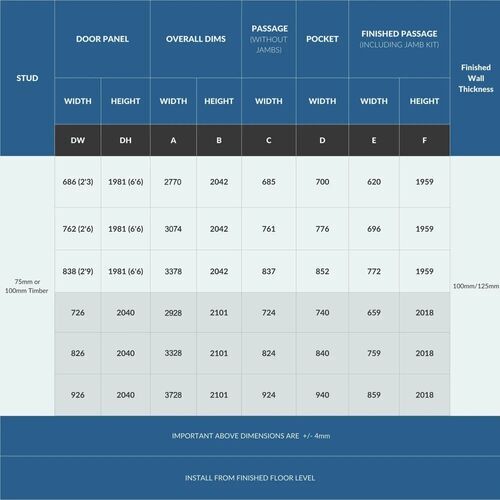 - 100mm finished wall thickness (with 12.5 mm plasterboard)