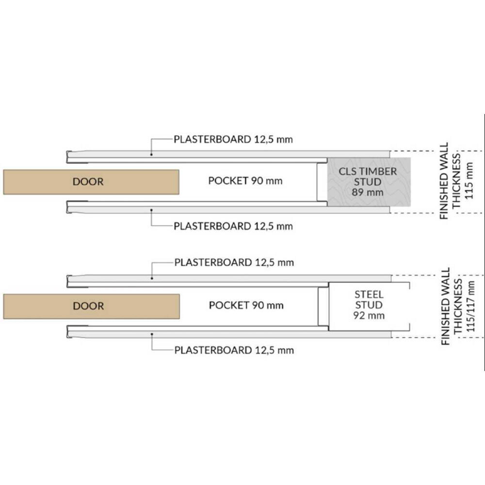 Complete pocket sliding door system for double doors with galvanised steel pocket frame, sliding track and running gear. 90mm thick frame is made specifically to fit 89mm CLS stud work making installation even easier than before. It can also be used with 92mm Steel stud.