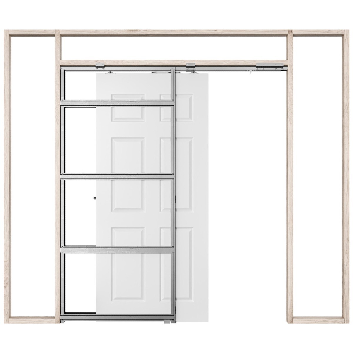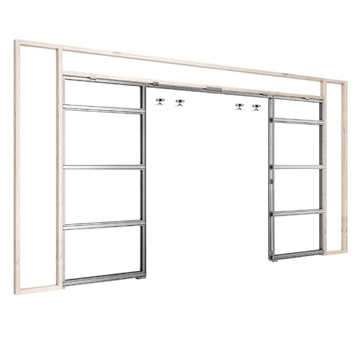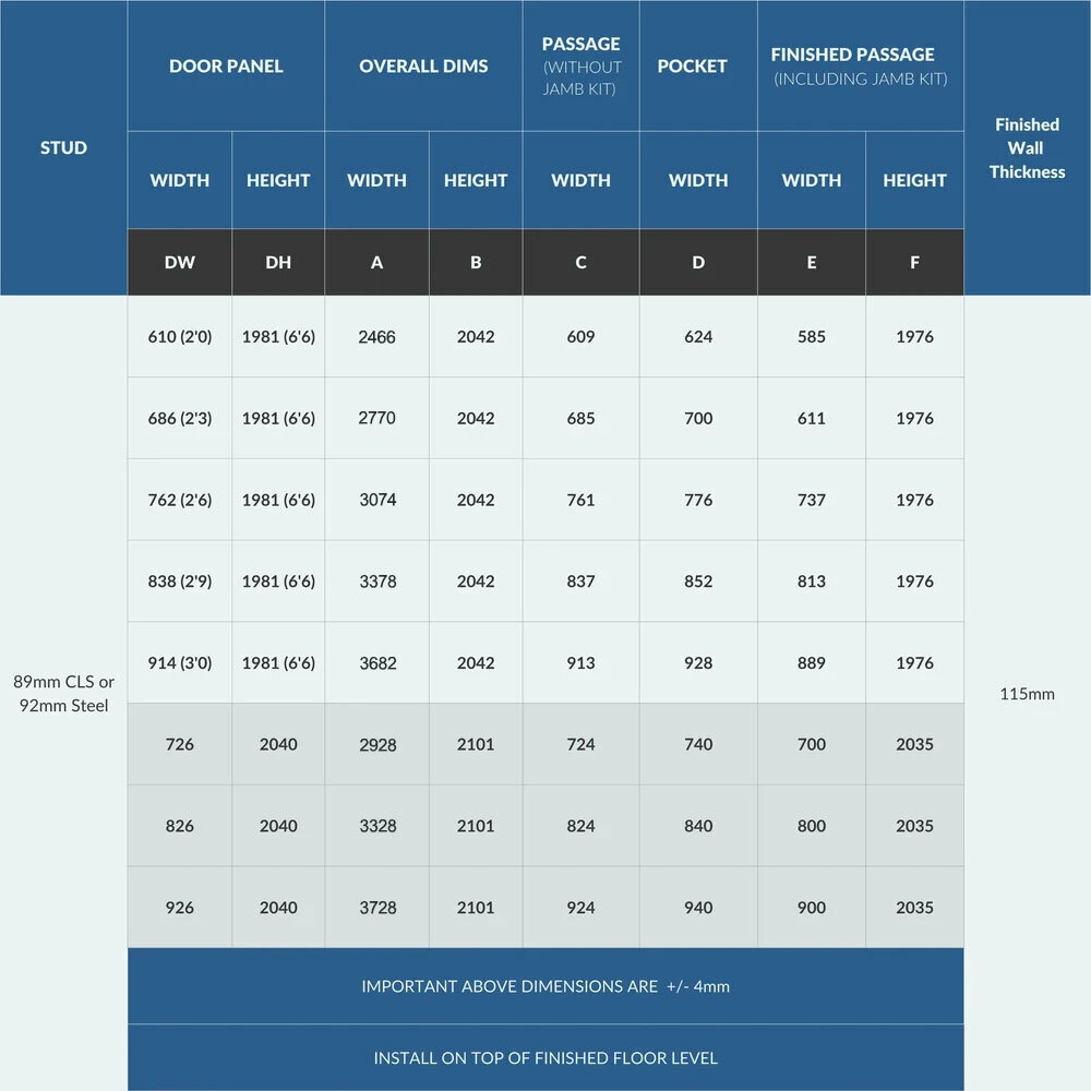 Complete pocket sliding door system for double doors with galvanised steel pocket frame, sliding track and running gear. 90mm thick frame is made specifically to fit 89mm CLS stud work making installation even easier than before. It can also be used with 92mm Steel stud.