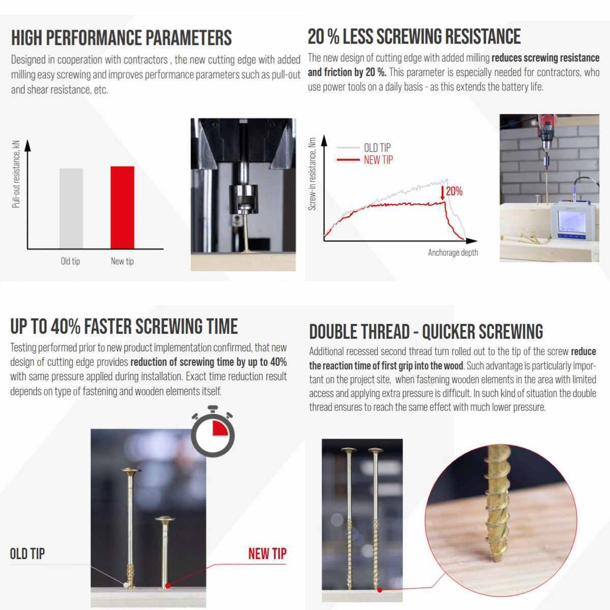 - Double threaded tip – reduces screwing time by 40% and pressure required when screwing