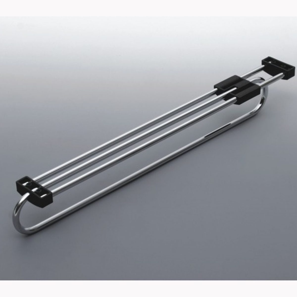Upgrade your wardrobe organization with the heavy-duty pull-out clothes hanger E50. This robust rail features twin and double standard thickness sliding bars, ensuring strength and a guaranteed load capacity. With a chrome finish and black fittings, it’s both functional and stylish. Please note that screws are not included for attaching the rail to your furniture piece.