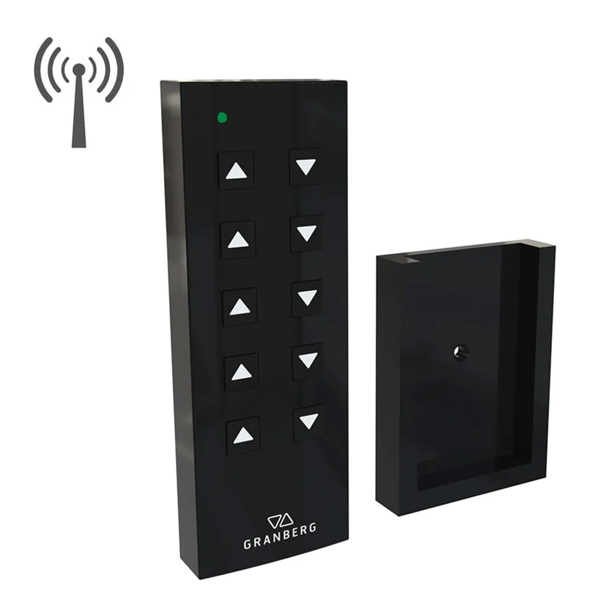 The radio control remote for Granberg Butler for wardrobe lift systems (in black) is designed for seamless operation of 1-5 lifting systems, offering flexibility and convenience for height-adjustable kitchen systems. It includes a wall-mounted holder, ensuring the remote is always within reach.