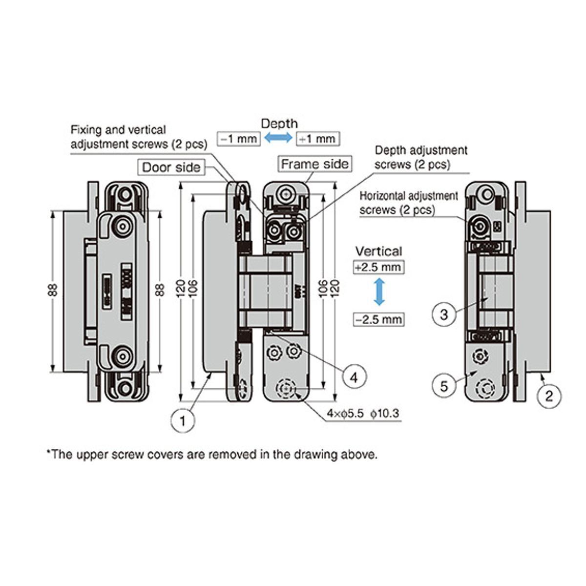 The Sugatsune HES3D-120-A100 hinge is engineered for exceptional strength and durability, making it the perfect solution for heavy doors in both high-traffic commercial environments and upscale residential settings. With its robust construction and advanced 3-way adjustability, the HES3D-120-A100 ensures precise alignment and smooth operation, providing reliable performance and a sleek, concealed appearance that enhances the aesthetic appeal of any door installation. Dedicated for room dividing or entrance doors making installation a breeze with 3 way vertical, horizontal and depth adjustment.