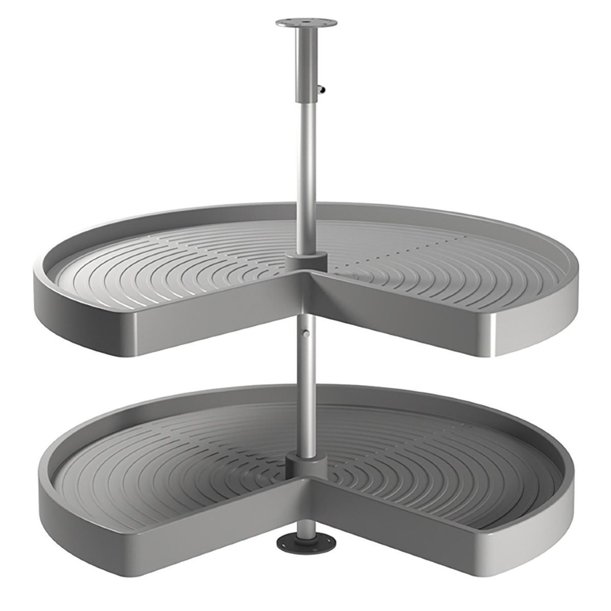 High-quality kitchen corner carousel made in Germany. Solid base spinning shelves made of sturdy plastic are perfect for storing pots and pans but are also great for groceries, jars, and cans. The top shelf height can be adjusted to accommodate taller items at the bottom - they also swivel independently.