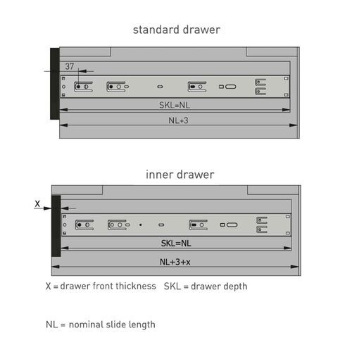 - Suitable for side mounting (non-handed) or fitting into a 45mm wide x 12.7mm deep grooved drawer side