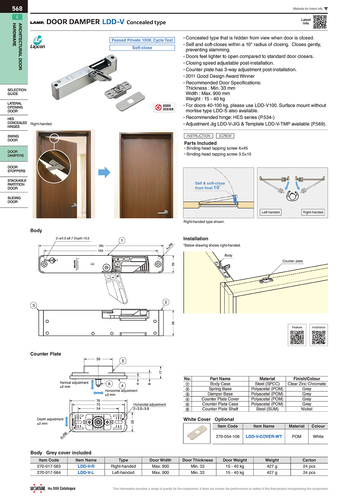 The Sugatsune LDD-V Concealed Door Damper features self-closing and soft-closing capabilities. Adjustable closing speed and a concealed design that remains hidden when the door is closed, making it perfect for doors up to 900mm wide and 15-40kg in weight.