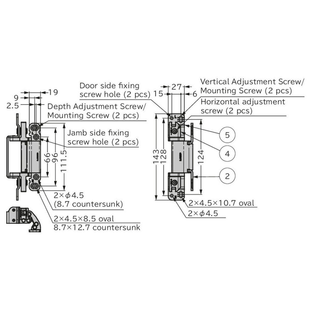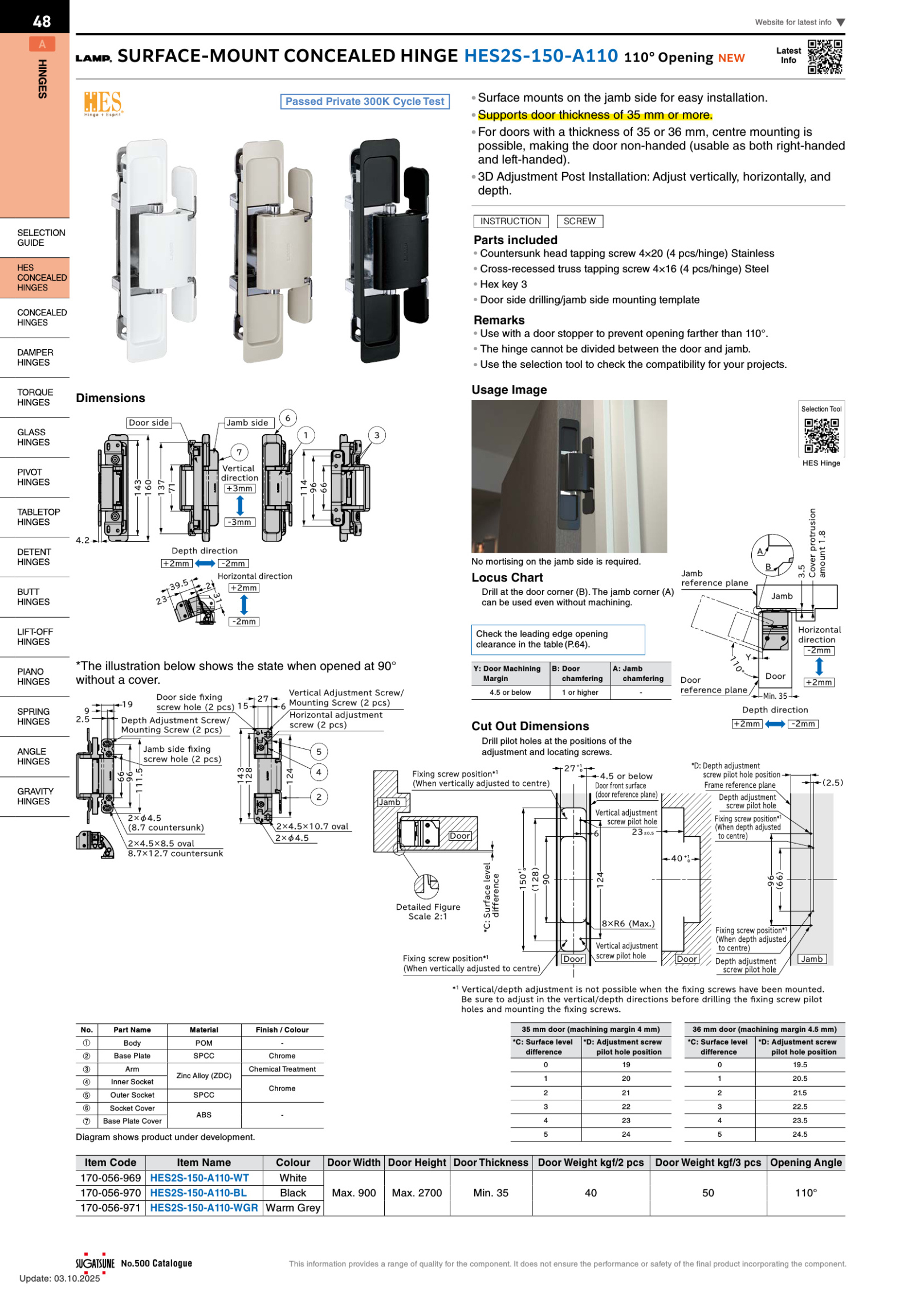 Discover the HES2S-150-A110 Surface-Mount Concealed Hinge from Sugatsune, designed for easy installation and a sleek, hidden look, perfect for high-end furniture and architectural projects. This award-winning hinge offers 3-way adjustment and exceptional durability, having passed a 300,000 open/close cycle test. Dedicated for room dividing or entrance doors making installation a breeze with 3 way vertical, horizontal and depth adjustment.