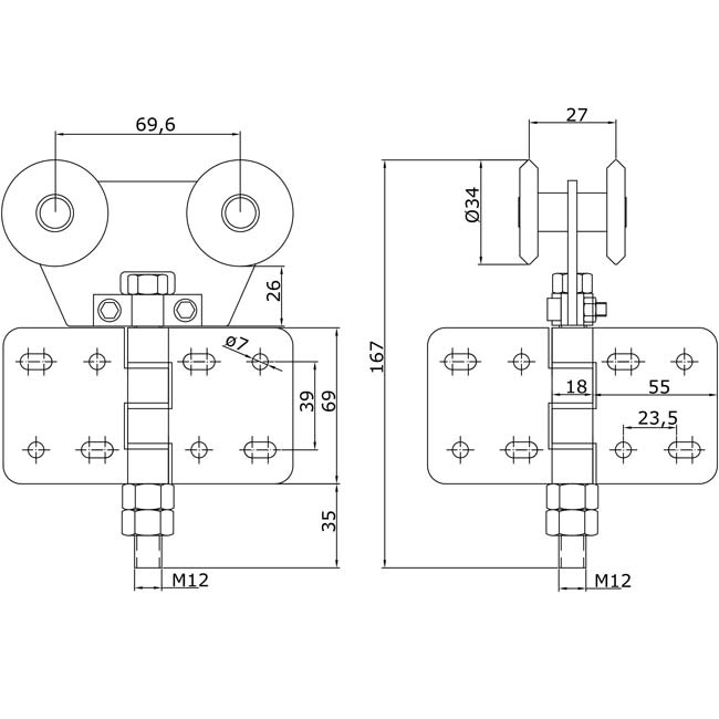 The U-40 steel/nylon middle hinge trolley for curved/folding industrial sliding track systems for commercial and agricultural applications. Perfect for enabling doors to either slide round a corner or fold to one side. This trolley slides into the U-40 top track and is screwed into a door panel which enables them to slide and fold. Designed with 4 nylon wheels and 1 middle hinge allocated in the screw of the trolley. The hinge plates would be screwed to both door panels by screwing each leaf of the hinge, which permits the folding and swinging movement for sliding curved/folding systems.