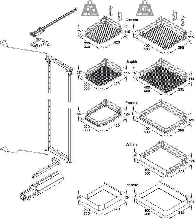 Brand new kitchen storage solution range in Vauth Sagel family finished in unique grey colour and style. Powder-coated steel plate formed around an inlaid wooden shelf with a seal all the way around forms every tray supplied with a unit. It results in a flat contemporary design and great storage capacity. Swing-out larder provides ease of use and access to your goods thanks to automatic pull-out action.