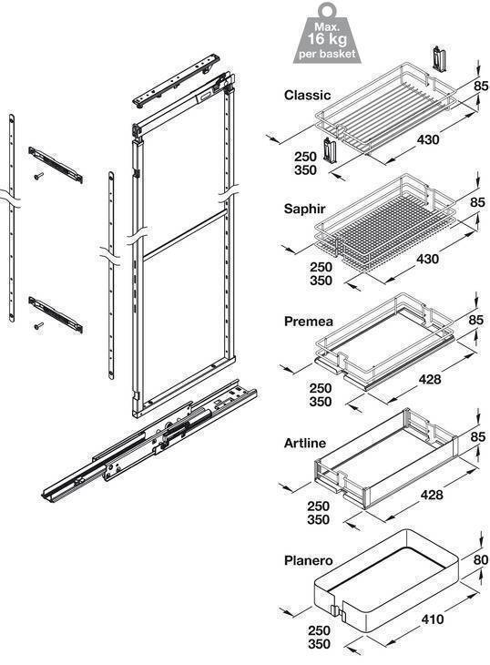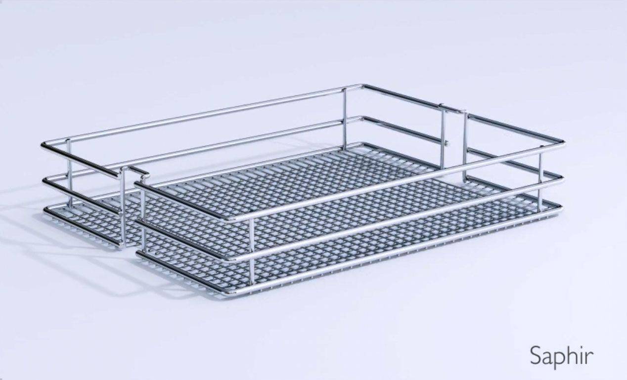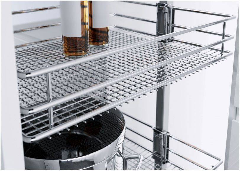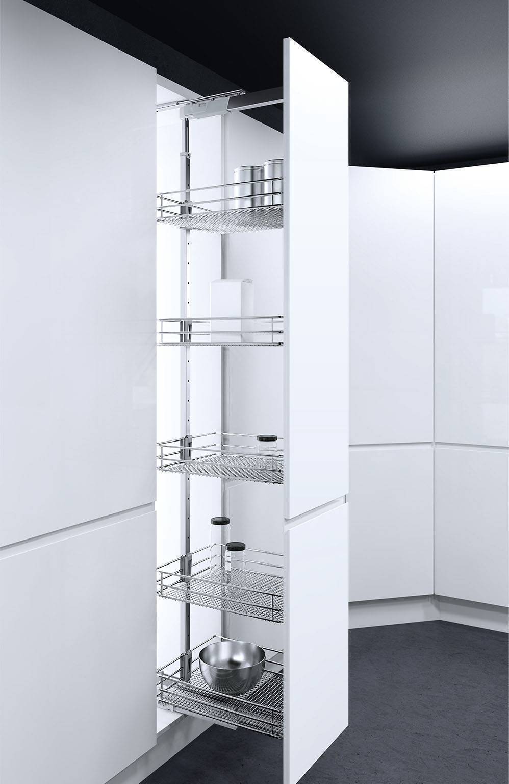 Pull-out larder unit made by Vaugth Sagel (Germany) with silver frame and Saphir mesh chrome baskets. Want to save space and have access to the back of your cabinet then look no further.